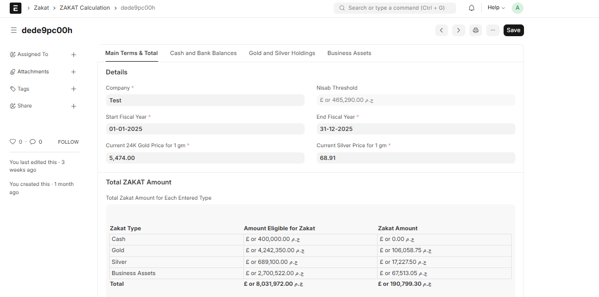 - Total Cash Amount: Validates if the amount exceeds the Nisab threshold.