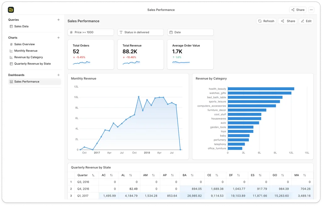 Use our intuitive query builder to explore your data, create custom calculations, and build insightful reports – no SQL required!.